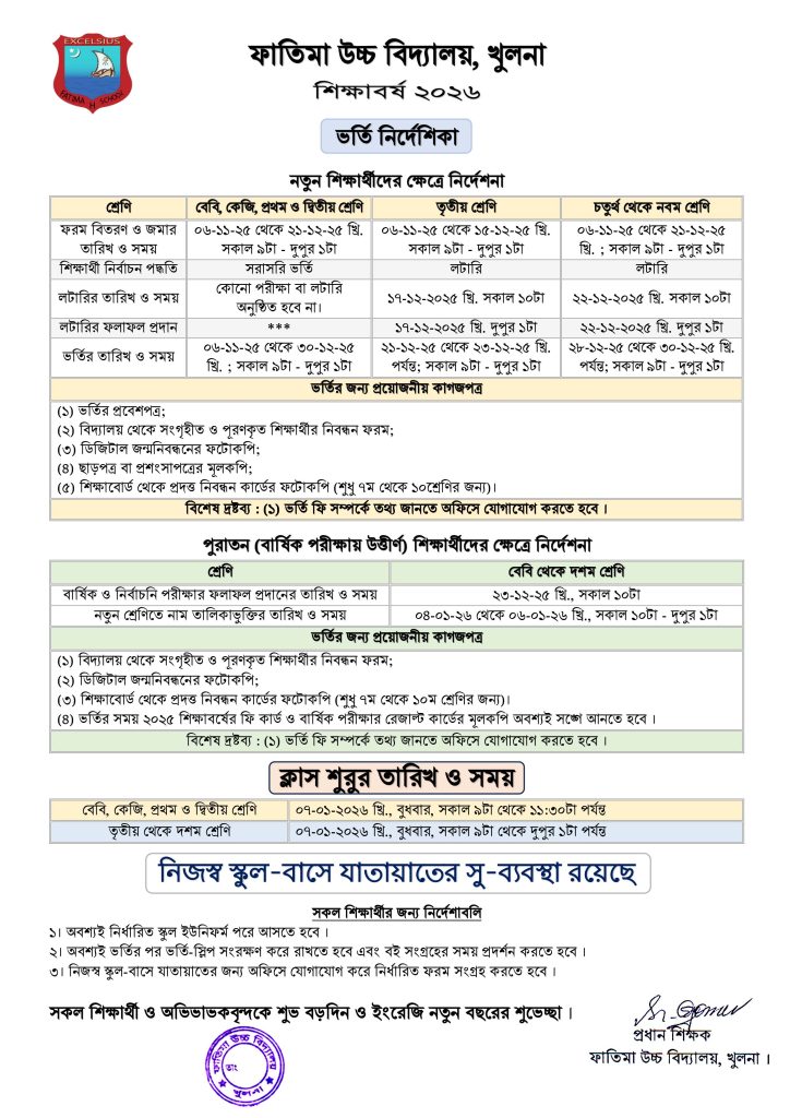 ২০২৬ শিক্ষাবর্ষের ভর্তির নির্দেশিকা