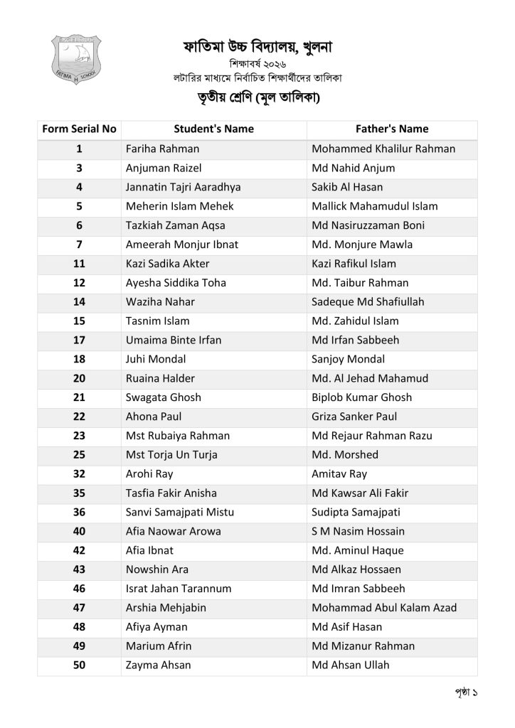 তৃতীয় শ্রেণির লটারির মাধ্যমে নির্বাচিত শিক্ষার্থীদের তালিকা ২০২৬ - Fatima High School